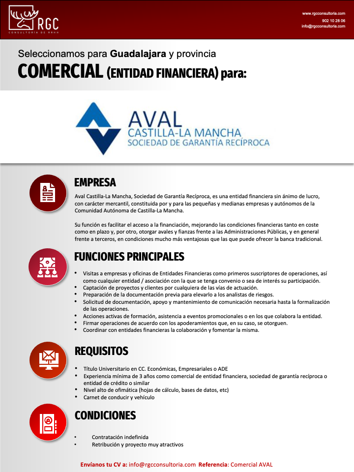 RGC Consultoría de RRHH desarrolla el proceso de selección para AVAL CASTILLA LA MANCHA en el puesto vacante para Guadalajara y provincia.